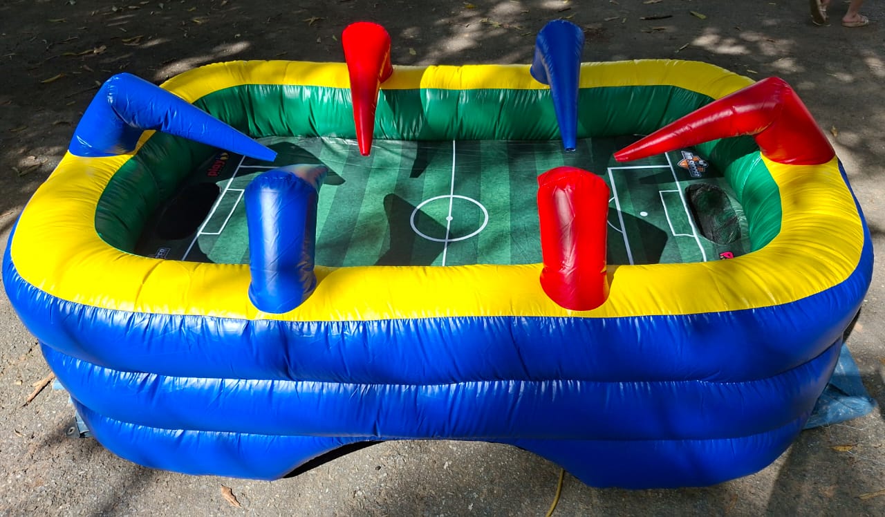 Entre em campo no Air Soccer inflável! Sopre forte e marque gols nesta disputa para até 6 pessoas. Diversão garantida na sua festa!