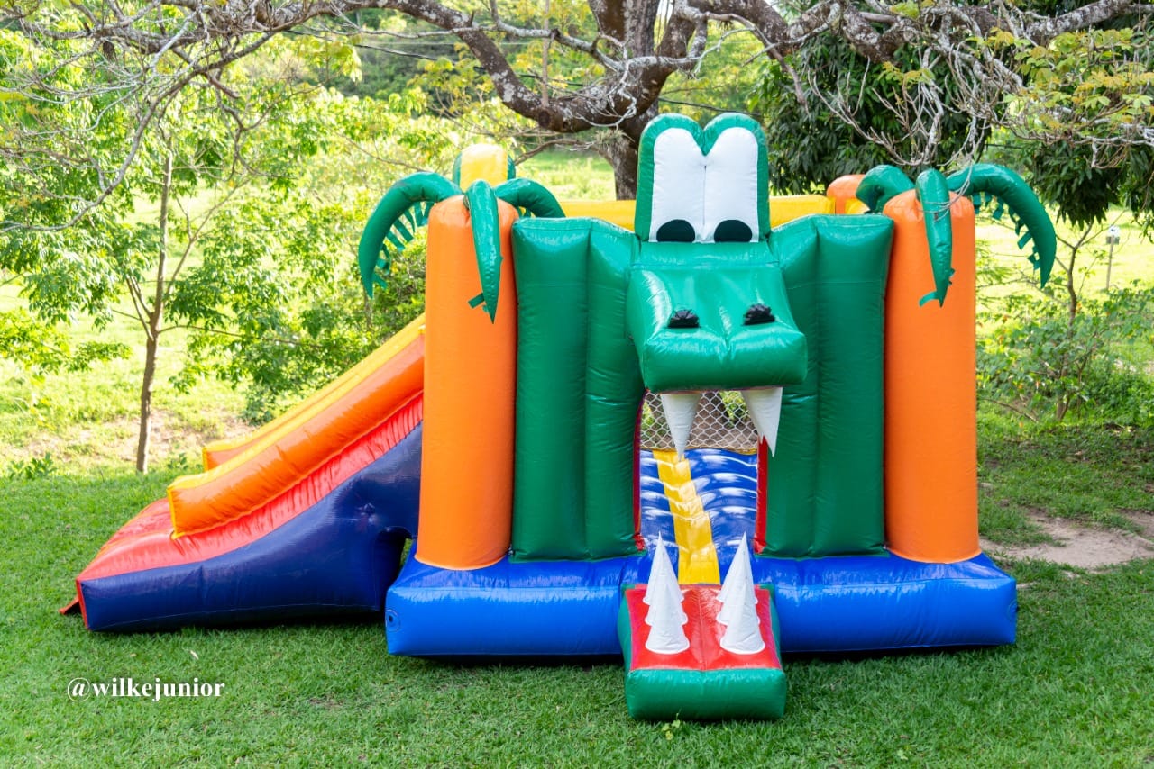 Aventura na selva garantida! O Crocoselva une Pula-Pula, Escalada e Escorregador (3 em 1). Surpreenda a criançada e arrase no evento!